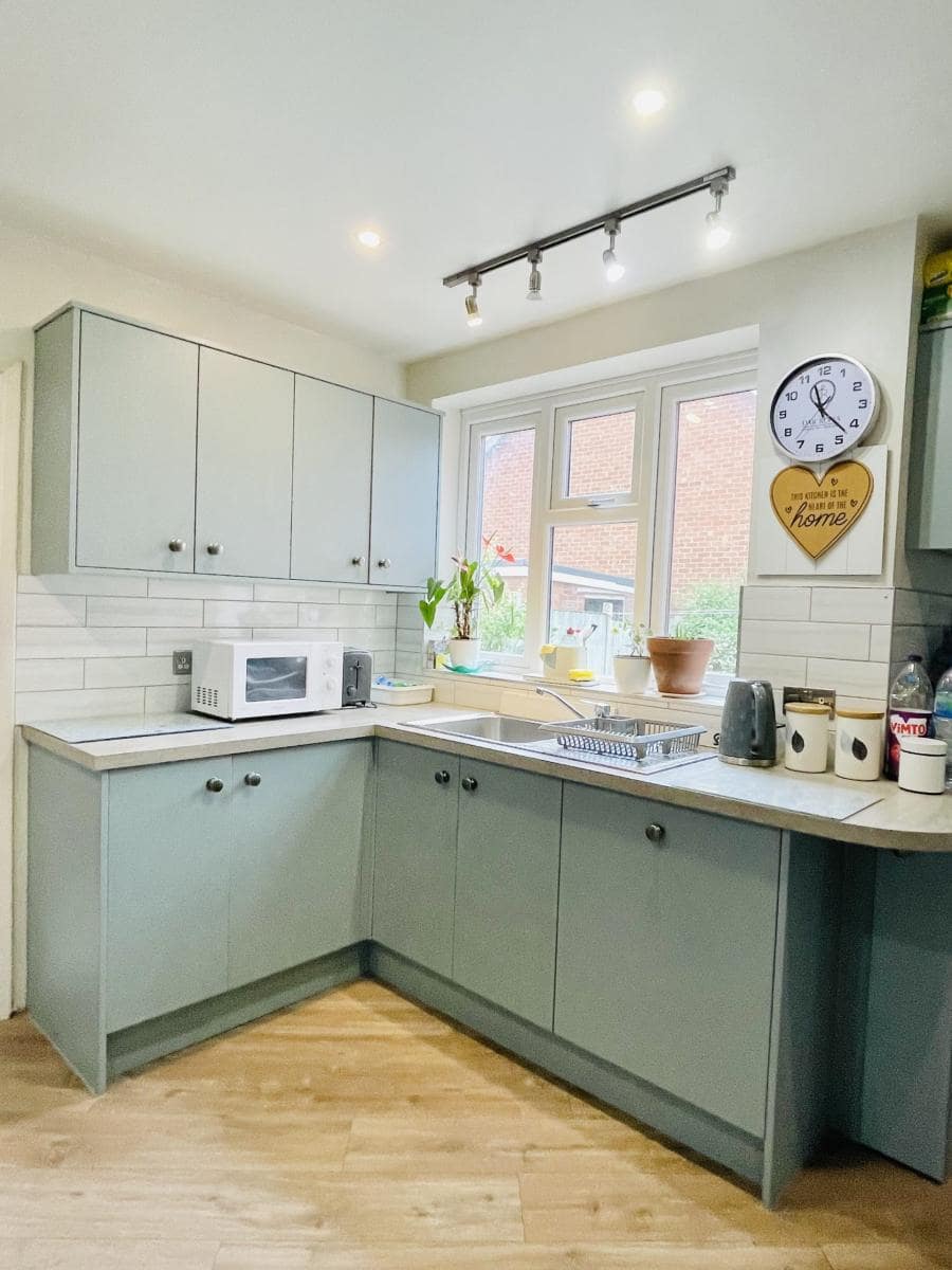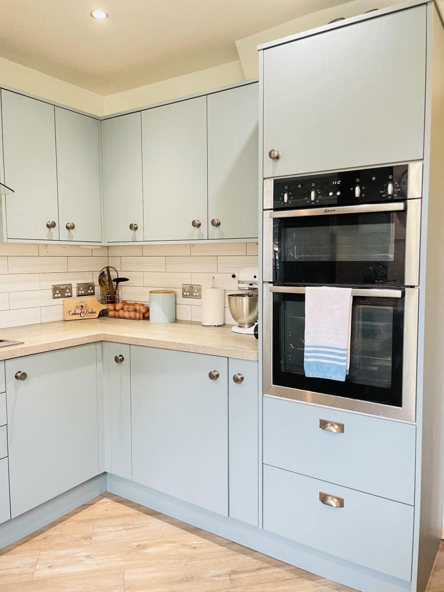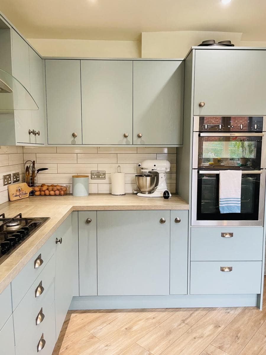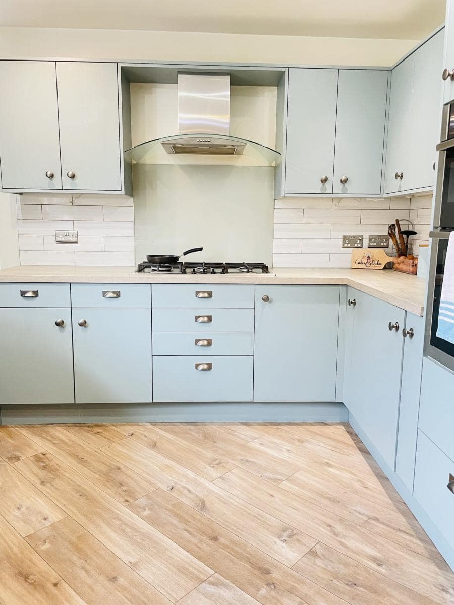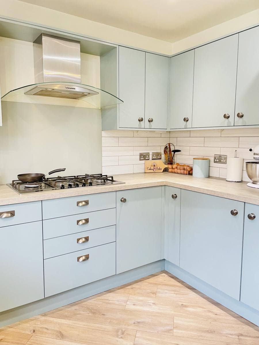 The soothing colour of this kitchen is enough to make anyone start rustling up a batch of home-made pancakes!
